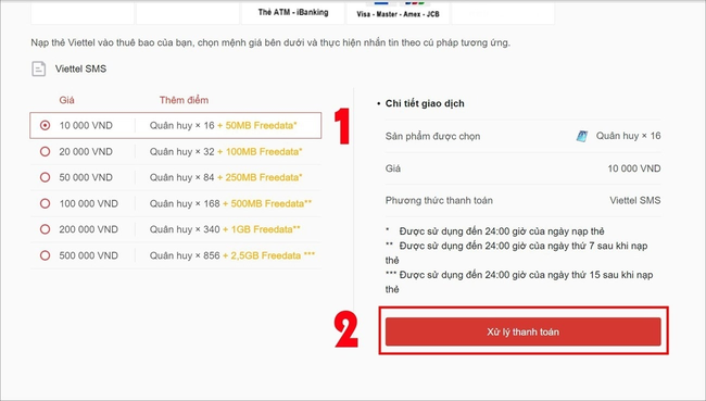 Khi bảng giá xuất hiện, hãy lưu ý rằng tỷ giá sẽ được tính bằng đô la Mỹ (USD). Tiếp theo, bạn có thể lựa chọn phương thức nạp mà mình ưa thích, có thể nạp qua SMS hay các ví điện tử như MoMo. Nếu bạn chọn nạp qua SMS, hãy xác định nhà mạng mà bạn đang sử dụng, ví dụ như Viettel hoặc Vinaphone.