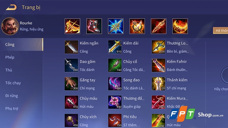 Giày du mục cũng là một lựa chọn tối ưu để tăng tốc độ di chuyển, giúp Rourke dễ dàng tiếp cận đối thủ. Để đạt hiệu quả cao nhất, hãy lên đồ theo thứ tự: Cung bão tố > Giày du mục > Thương Longinus > Thánh kiếm > Kiếm Murasama > Huân Chương Troy. Cuối cùng, luôn nhớ sử dụng chiêu 1 để áp đảo đối phương và chiêu 2 để tạo hiệu ứng đẩy lùi, tạo lợi thế cho đội nhà trong giao tranh.