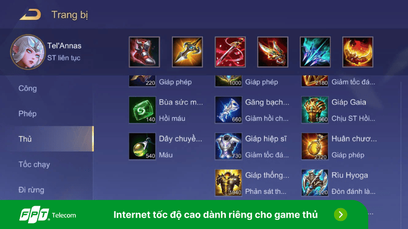 Lên đồ cho Tel’Annas trong mùa 2024 thực sự là một điều cần phải chú ý nếu bạn muốn tối ưu hóa sức mạnh của cô ấy. Bộ trang bị mạnh nhất dành cho Tel’Annas bao gồm Giày Du Mục, Thánh Kiếm, Song Đao Bão Táp, Diệt Thần Cung, Cung Tà Ma và Giáp Hộ Mệnh. Mỗi món trang bị đều mang lại những lợi ích thiết thực, giúp tăng cường khả năng tấn công và sống sót trong các trận đấu.