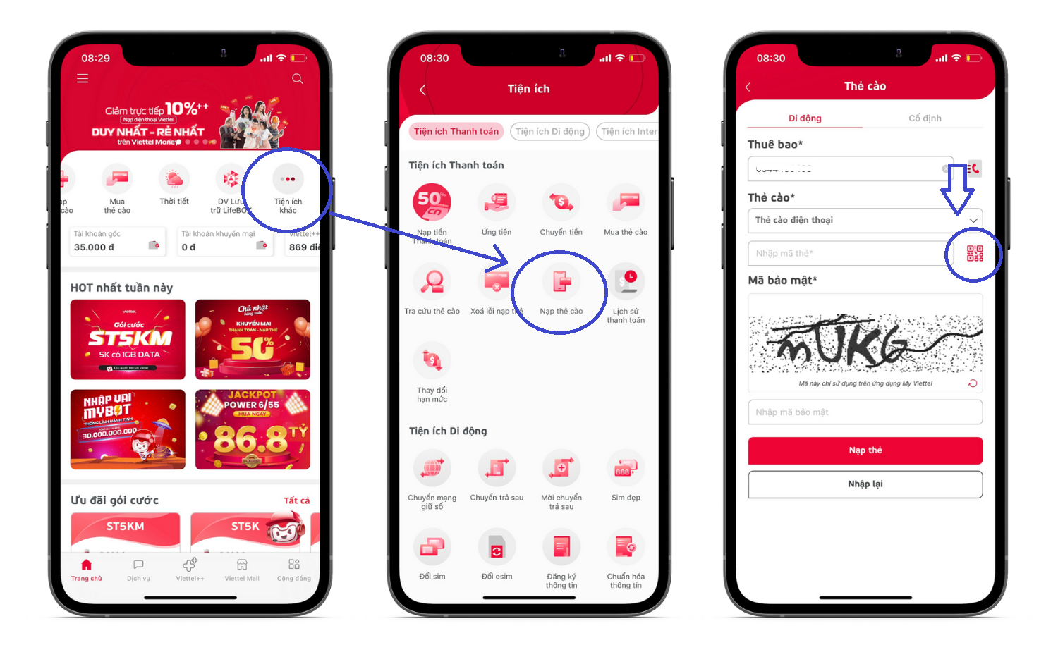 Để bắt đầu, bạn hãy đăng nhập vào ứng dụng My Viettel. Trên giao diện chính, chọn chức năng “Quét mã”, sau đó đưa camera vào khu vực mã QR trên thẻ cào. Các bước thực hiện rất nhanh chóng và dễ hiểu. Nếu bạn cảm thấy băn khoăn, có thể xem video hướng dẫn chi tiết để nắm rõ hơn về quy trình này.