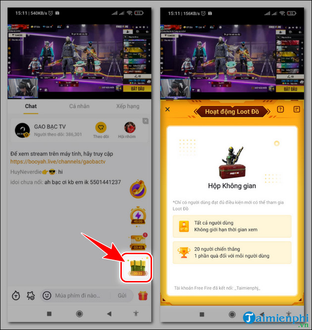 Nếu bạn là fan của Free Fire, thì chắc chắn không thể bỏ qua Booyah App! Ứng dụng này không chỉ cung cấp các livestream hấp dẫn mà còn mang đến cơ hội nhận quà cực kỳ giá trị. Khi tham gia xem các buổi livestream, bạn có thể nhận được những phần quà như Kim Cương, Hộp Đầu Vui Nhộn và Vé BOOYAH. Đặc biệt, chỉ cần xem từ 15 đến 40 phút là bạn đã có thể nhận quà.