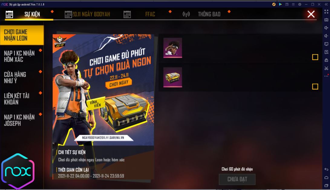 Nếu bạn chơi qua giả lập Noxplayer, đừng quên đăng nhập tài khoản Google của mình để tham gia vào các sự kiện và nhận quà từ Booyah nhé! Tận dụng mọi cơ hội để không bỏ lỡ những phần thưởng hấp dẫn mà Booyah dành tặng cho các game thủ Free Fire!