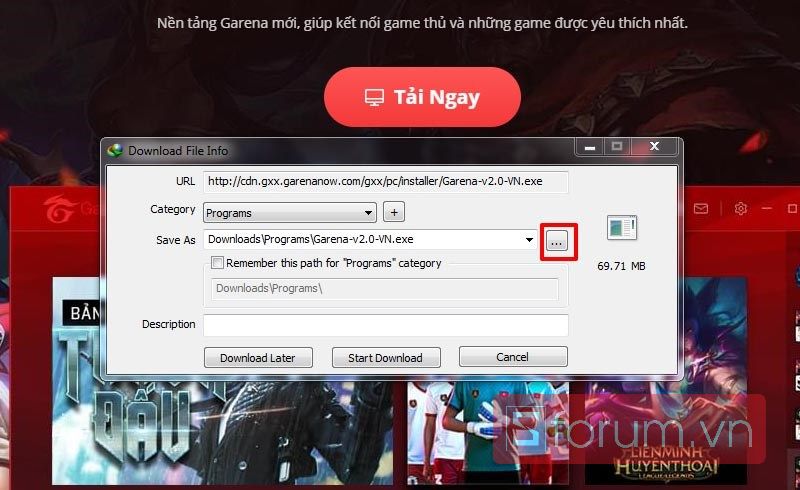 Quá trình tải về rất đơn giản. Sau khi nhấn vào nút “Tải ngay”, bạn sẽ cần chọn khu vực lưu cho file cài đặt. File tải về chỉ có dung lượng khoảng 69,7MB, không chiếm nhiều dung lượng máy tính của bạn đâu. Sau khi tải xong, hãy nhấn đúp chuột vào file GarenaPlus-v2.0-VN để bắt đầu cài đặt.