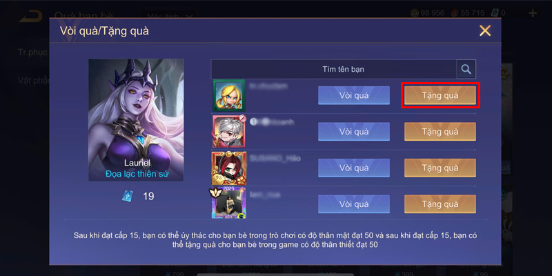 Tặng quà cho bạn bè trong Liên Quân Mobile không chỉ là một cách thể hiện tình cảm mà còn giúp kết nối và cùng nhau trải nghiệm game. Đầu tiên, bạn hãy vào danh sách bạn bè để lựa chọn người mà mình muốn tặng quà. Việc chọn bạn bè này rất đơn giản, chỉ cần tìm kiếm và bấm vào tên của họ.
