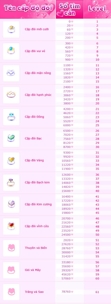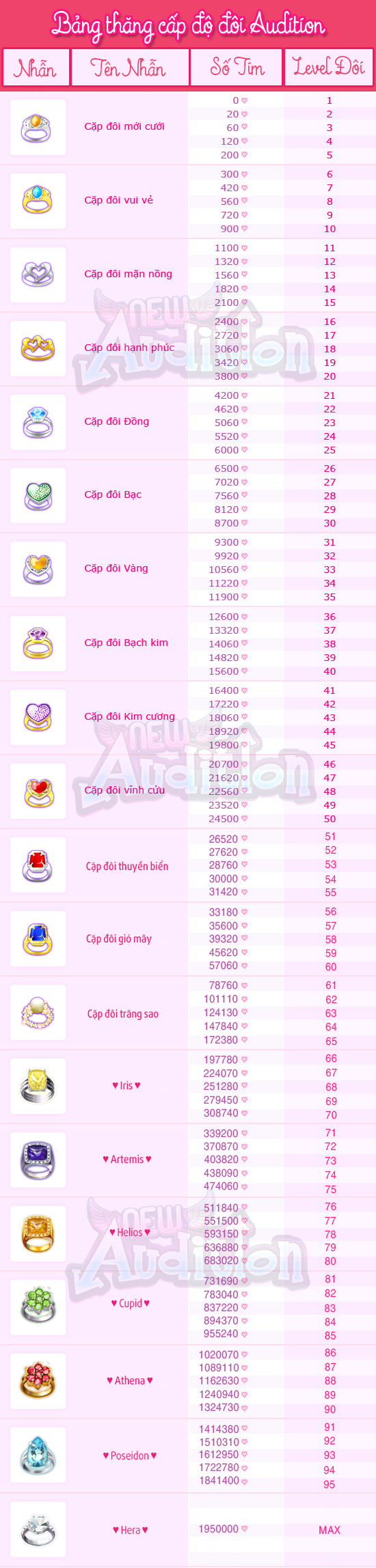 Trong thế giới của Audition, việc lên nhẫn không chỉ là một trò chơi, mà còn là hành trình thể hiện tình yêu và những kỷ niệm đẹp. Mỗi 5 level, các bạn sẽ phải thực hiện một nhiệm vụ đặc biệt để nhận danh hiệu mới cùng chiếc nhẫn mang thiết kế độc đáo, từ những chiếc nhẫn đơn giản đến những món phụ kiện lấp lánh, thể hiện đẳng cấp của các cặp đôi.