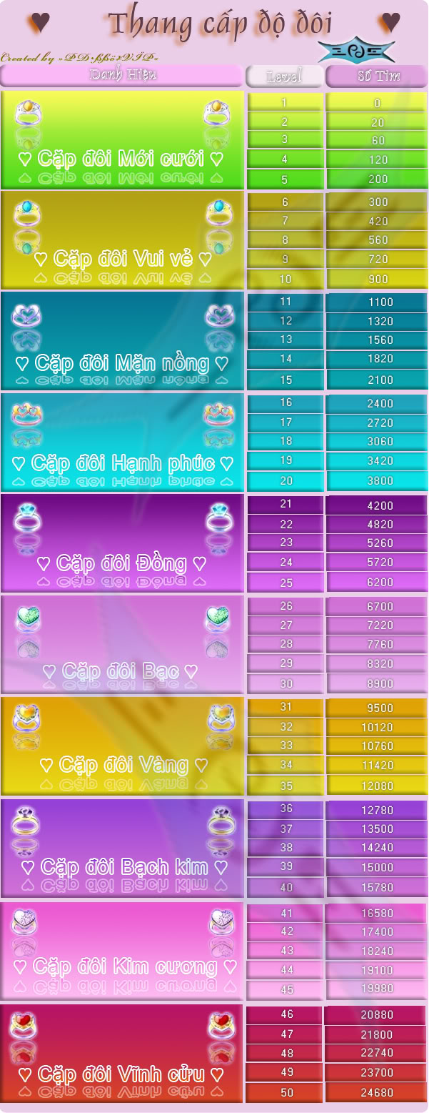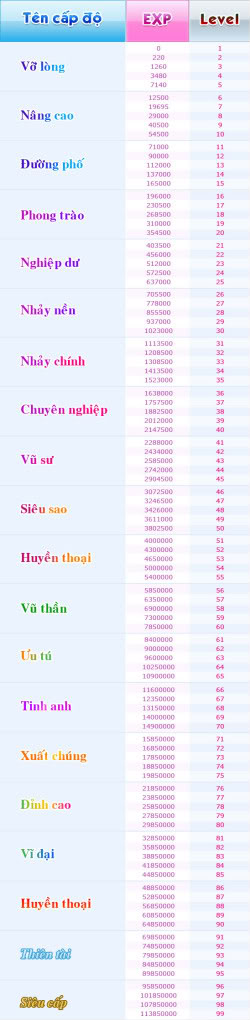 Cấp Độ X Audition đang mang đến một cuộc cách mạng mới cho các cặp vợ chồng yêu thích vũ điệu trong thế giới ảo. Với bảng thang cấp độ đôi đầy đủ từ Level 1 đến Level 126, người chơi có thể dễ dàng theo dõi thứ hạng của mình và nắm rõ hơn về các cấp độ nhẫn trong game. Mỗi 5 level, bạn sẽ phải thực hiện một nhiệm vụ thú vị để nhận danh hiệu mới và những chiếc nhẫn có thiết kế đẹp mắt.