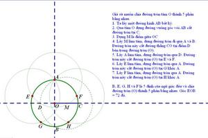 Tiếp theo, từ tâm O của hình tròn, bạn dựng một đường vuông góc với đường kính này. Điều này giúp xác định các điểm cần thiết để chia đoạn tròn thành 5 phần bằng nhau. Để tính toán, bạn cần xác định số độ cho mỗi phần: 360 độ chia cho 5 bằng 72 độ.