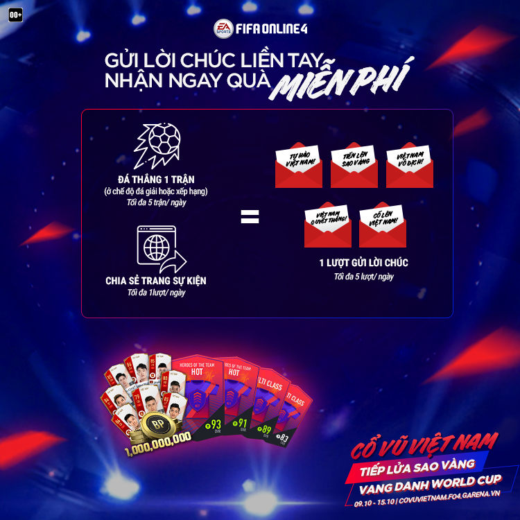 Sự kiện không chỉ mang đến cơ hội thưởng thức FO4 mà còn cho phép HLV cùng nhau rinh siêu sao, nâng cấp thẻ cầu thủ, góp phần đẩy mạnh thứ hạng của Việt Nam. Hãy cùng nhau gửi những lời chúc tốt đẹp đến đội tuyển và thể hiện tình yêu bóng đá của mình!
