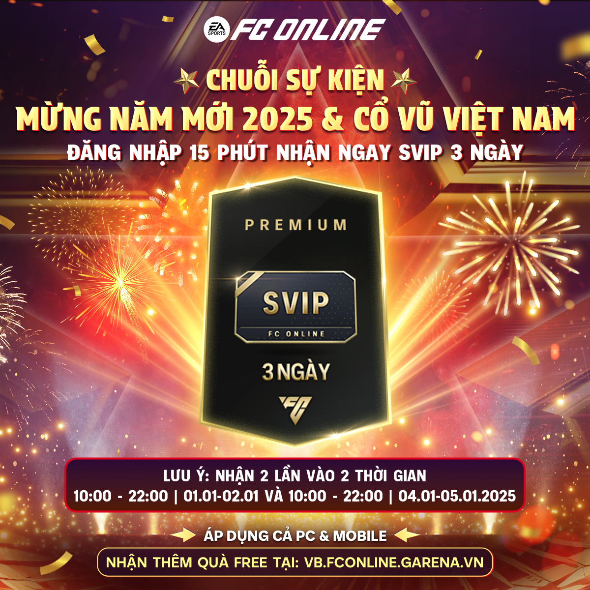 Nếu bạn là một fan hâm mộ của FIFA Online 4, đừng bỏ lỡ sự kiện “Cổ Vũ Việt Nam” hấp dẫn lần này! Bắt đầu từ ngày 04.10, bạn có thể đăng nhập vào FC Online mỗi ngày để hoàn thành nhiệm vụ và tích lũy điểm cổ vũ. Chỉ cần chơi một trận đấu, online khoảng 10 phút hay thắng một trận đấu là bạn đã có cơ hội nhận những phần quà thú vị.