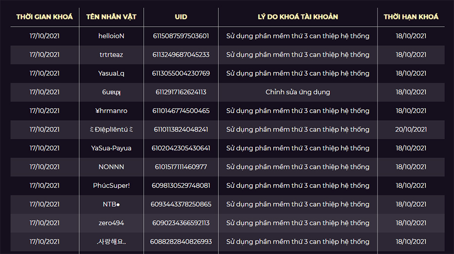 Gần đây, nhiều tài khoản đã bị khóa vĩnh viễn do vi phạm nghiêm trọng, với một số tài khoản bị khóa đến tận năm 2082 hoặc 2090. Điều này cho thấy sự nghiêm túc của nhà phát hành trong việc đảm bảo môi trường chơi game lành mạnh. Bảng phong thần được cập nhật thường xuyên, giúp người chơi dễ dàng theo dõi các tình huống xử phạt mới nhất.