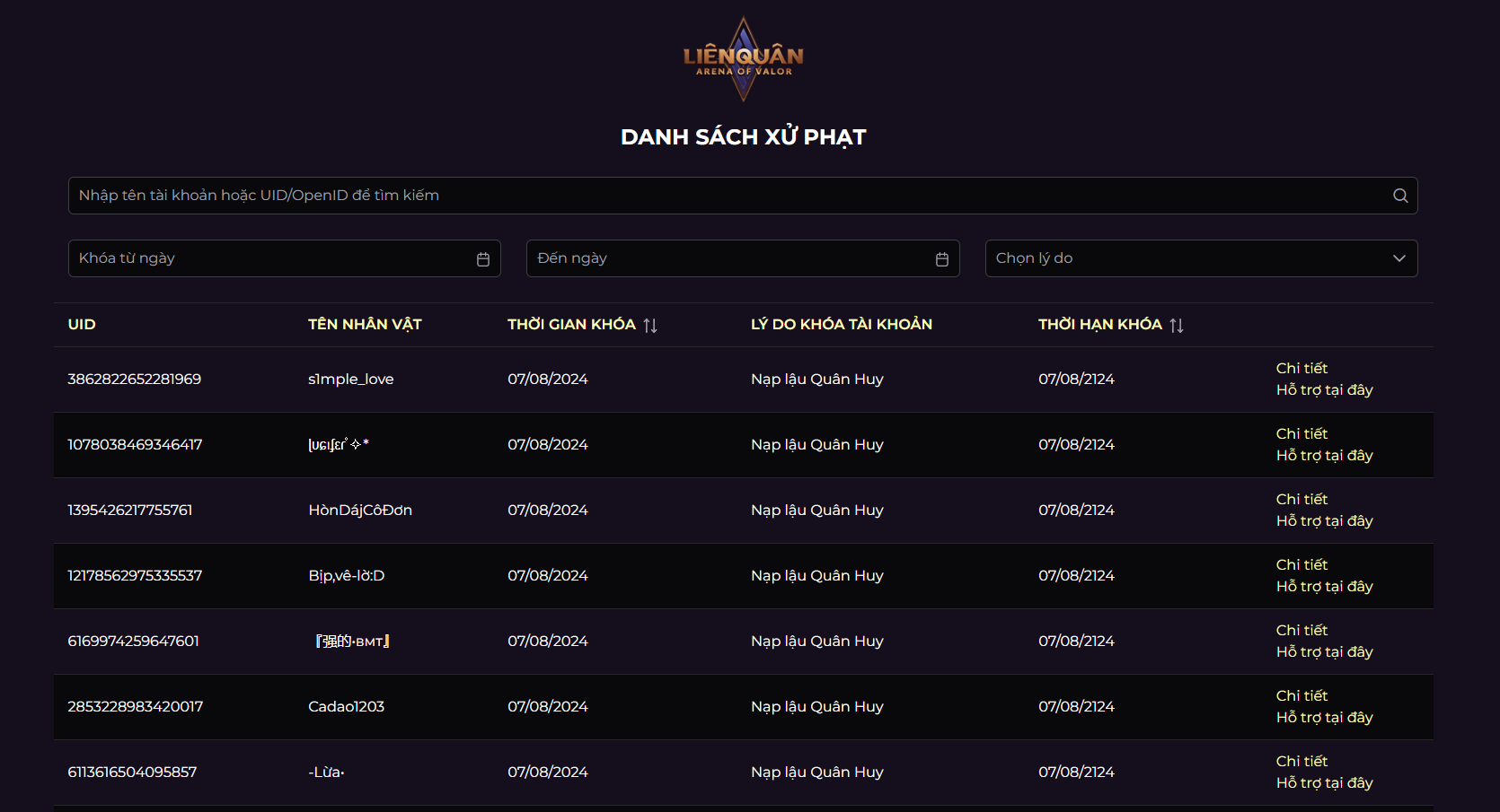 Trong thế giới của Liên Quân Mobile, việc duy trì một môi trường chơi game lành mạnh là rất quan trọng. Mới đây, danh sách xử phạt các thành viên vi phạm đã được công bố, giúp người chơi dễ dàng tra cứu thông tin. Bạn có thể nhập tên tài khoản hoặc UID/OpenID để tìm kiếm, cùng với các thông tin như thời gian khóa và lý do cụ thể.