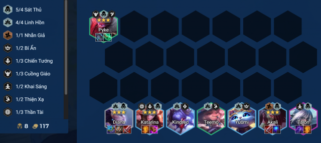 Trong giai đoạn đầu, bạn nên giữ lại Diana và Pyke sớm để kích hoạt hệ Sát Thủ. Đồng thời, nếu có thể, hãy thêm Janna hoặc Kindred vào đội hình để tăng cường khả năng chống chịu và hồi máu cho đội. Sát Thủ không chỉ là về sức mạnh tấn công mà còn cần có sự hỗ trợ từ các tướng bổ sung khác.