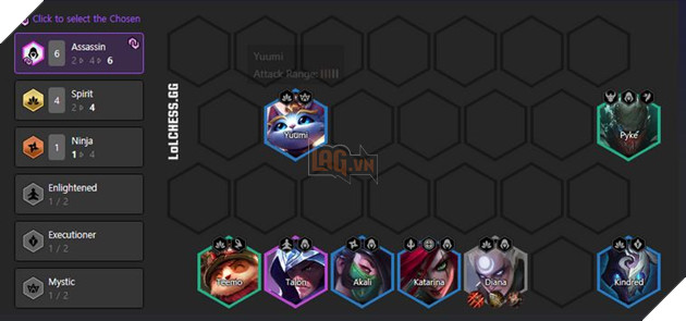 Zed, với vai trò là Đồ Tể, kết hợp hoàn hảo với các tướng khác, trong khi Akali trở thành một Sát Thủ xuất sắc, gây sát thương lớn. Ngoài ra, Diana và Pyke cũng đóng góp không nhỏ vào sức mạnh của đội hình khi kết hợp cùng các tướng Nhẫn Giả. Việc hoàn thiện đội hình với bốn Nhẫn Giả và thêm các tướng như Sát Thủ hay Bí Ẩn sẽ giúp bạn tạo ra sức mạnh vượt trội.