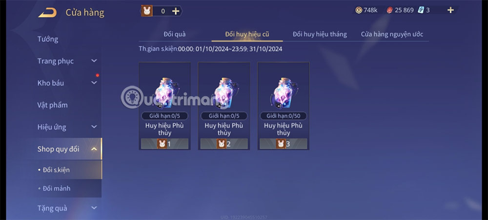 Để tham gia, bạn chỉ cần vào trong Cửa hàng, chọn Shop quy đổi, rồi chuyển tới mục Đổi sự kiện. Tại đây, bạn sẽ dễ dàng tìm thấy tùy chọn Đổi Huy Hiệu Tháng. Hãy kiểm tra số lượng Huy Hiệu Phù Thủy mà bạn đang có để đổi lấy những gì ưng ý nhất.