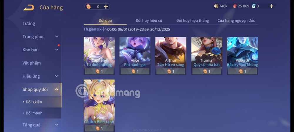 Khi đã vào đúng mục này, bạn có thể chọn đổi những món quà mà bạn mong muốn từ số lượng Huy Hiệu Phù Thủy mà mình đã tích lũy được. Việc đổi này không chỉ giúp bạn sở hữu skin mới mà còn có cơ hội nhận nhiều vật phẩm hữu ích khác. Chẳng hạn, bạn có thể nhìn thấy các tướng như Arum hay Allain đều cần 115 huy hiệu để đổi.
