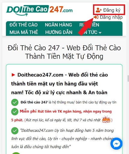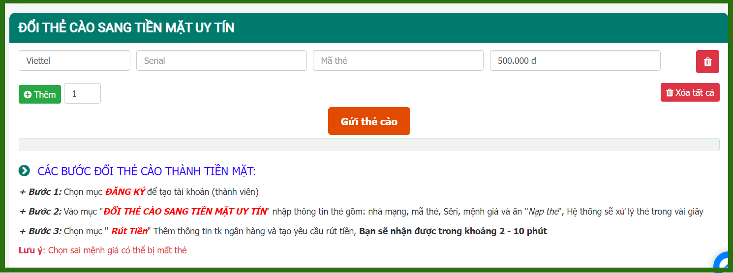 Sau khi vào trang, hãy chọn mục “Nạp game” và chọn mệnh giá thẻ mà bạn muốn, thấp nhất là 10.000 đồng. Nếu bạn có thẻ cào từ nhà mạng như Viettel, bạn có thể sử dụng dịch vụ tại doithecao247.com. Đầu tiên, bạn cần đăng ký tài khoản và nạp tiền vào tài khoản của mình.