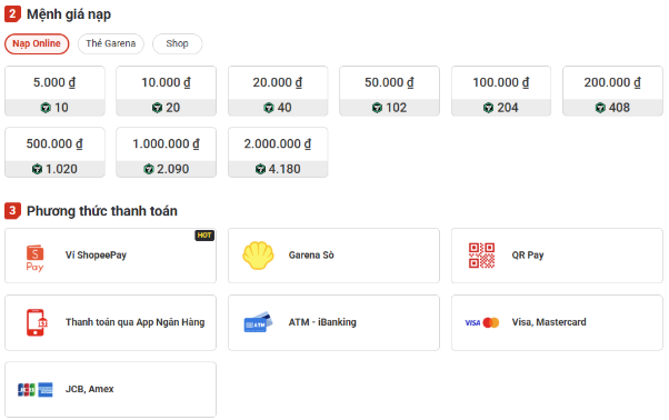 Nạp thẻ Garena là một trong những nhu cầu thiết yếu đối với game thủ yêu thích các tựa game nổi tiếng như Free Fire hay Liên Quân Mobile. Để nạp Sò, Quân Huy, RP hay FC, bạn có thể truy cập vào trang nạp thẻ chính thức của Garena. Việc nạp thẻ rất dễ dàng và an toàn, giúp bạn nhanh chóng tiếp cận với các tính năng hấp dẫn trong game.