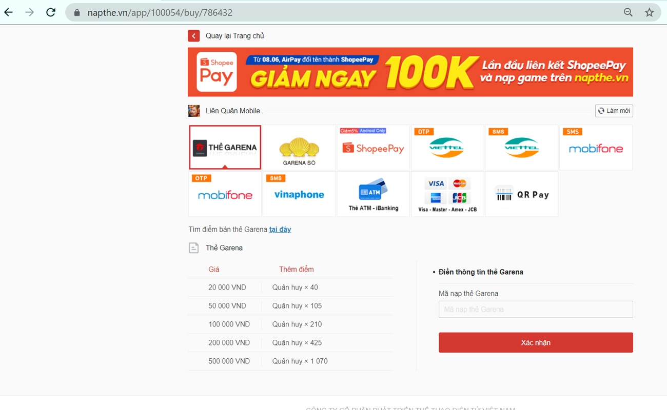 Nếu bạn chọn phương thức thanh toán bằng ShopeePay, hãy làm theo hướng dẫn đơn giản: đầu tiên, chọn phương thức ShopeePay, sau đó chọn gói nạp ưng ý. Bạn có thể mua thẻ Garena chính hãng trên VTC Pay với nhiều mệnh giá từ 20K đến 500K, đảm bảo thanh toán nhanh chóng và bảo mật 100%. Đừng quên nhập mã GARE05 để được giảm giá ngay 5.000đ cho lần nạp đầu tiên!