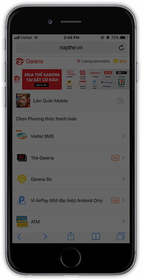 Một cách nạp thẻ khác cũng rất tiện lợi là thông qua Google Play hoặc App Store, với mức giá chỉ từ 0.99 USD bạn đã có thể nhận được đến 35 Quân Huy. Để bắt đầu, bạn hãy đăng nhập vào tài khoản cá nhân trên napthe.vn, sau đó chọn game Liên Quân Mobile và hình thức thanh toán mà bạn ưa thích, có thể là QR Pay hoặc Viettel Money.