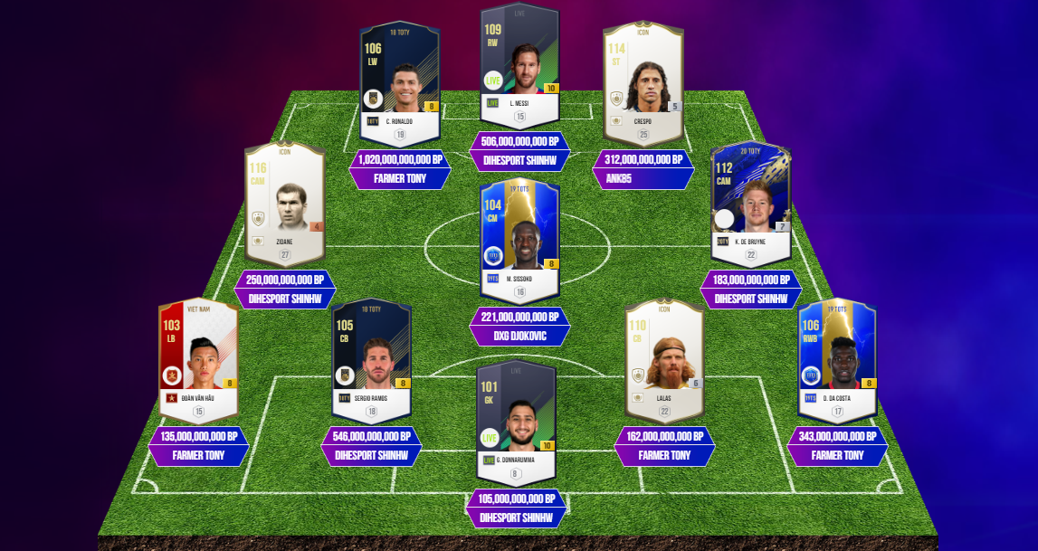 Được coi là một cuộc chiến không khoan nhượng, những đội hình có giá trị nhất tháng này chắc chắn sẽ làm bạn ấn tượng. Chúng ta không thể không nhắc đến đội hình của TonyTonyy với những cầu thủ huyền thoại như Ronaldo Icon +6, có giá trị lên đến hơn 16 nghìn tỷ BP, cùng với M.Essien Icon +7 trị giá hơn 3 nghìn tỷ BP.