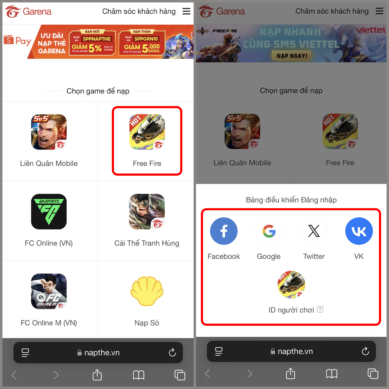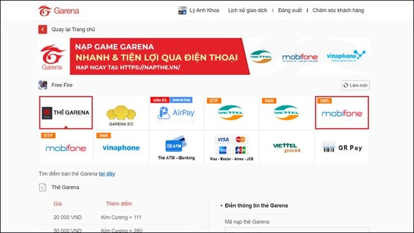 Để bắt đầu, bạn chỉ cần truy cập napthe.vn, chọn game Free Fire và đăng nhập vào tài khoản của mình. Trang web này hỗ trợ nhiều phương thức thanh toán an toàn như thẻ Garena, SMS qua nhà mạng Viettel, Mobifone, Vinaphone, ví Airpay, hay thẻ ATM – iBanking. Bước này giúp bạn linh hoạt hơn trong việc lựa chọn hình thức thanh toán phù hợp với mình.
