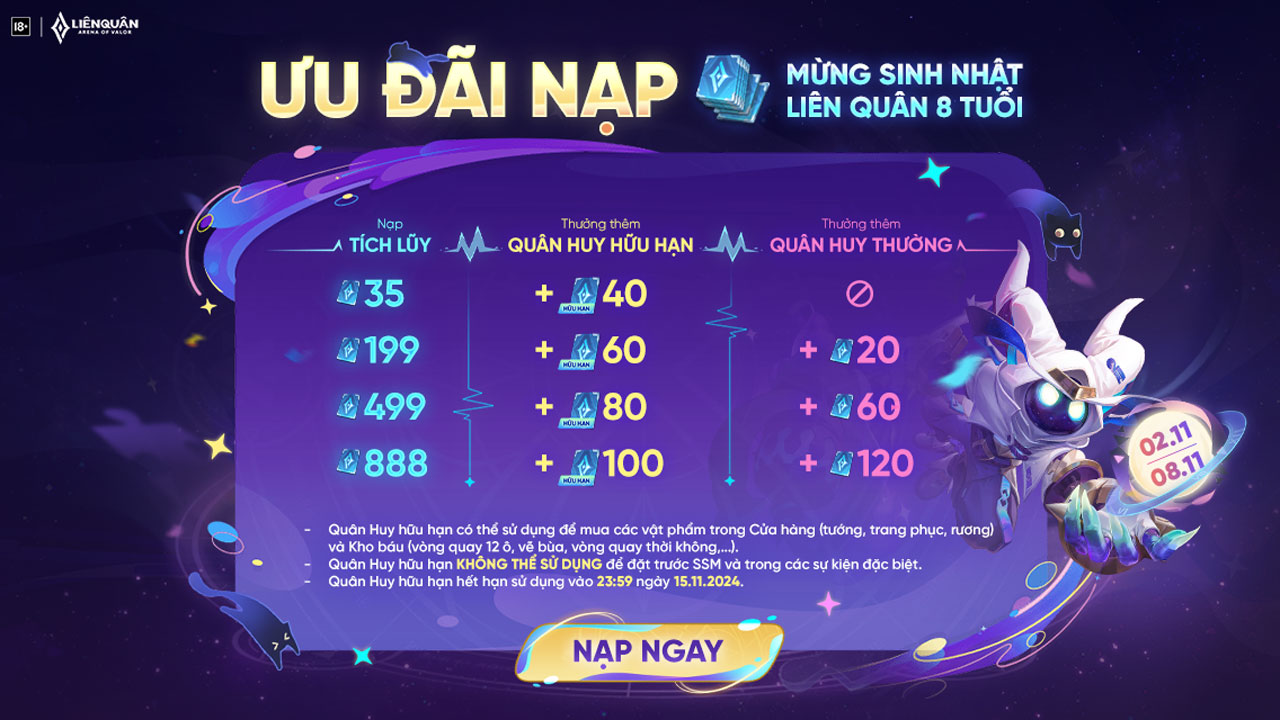 Chào các bạn, sự kiện khuyến mãi Nạp Quân Huy đang diễn ra từ 24/10 đến 31/10 với nhiều ưu đãi hấp dẫn không thể bỏ lỡ! Trong thời gian này, khi bạn nạp Quân Huy, sẽ nhận được một loạt phần thưởng thú vị, với tổng cộng 6 mốc nạp tích lũy khác nhau. Mốc nạp quan trọng nhất chính là 35 và 40 Quân Huy, hứa hẹn sẽ mang lại cho bạn những trải nghiệm tốt nhất trong game.