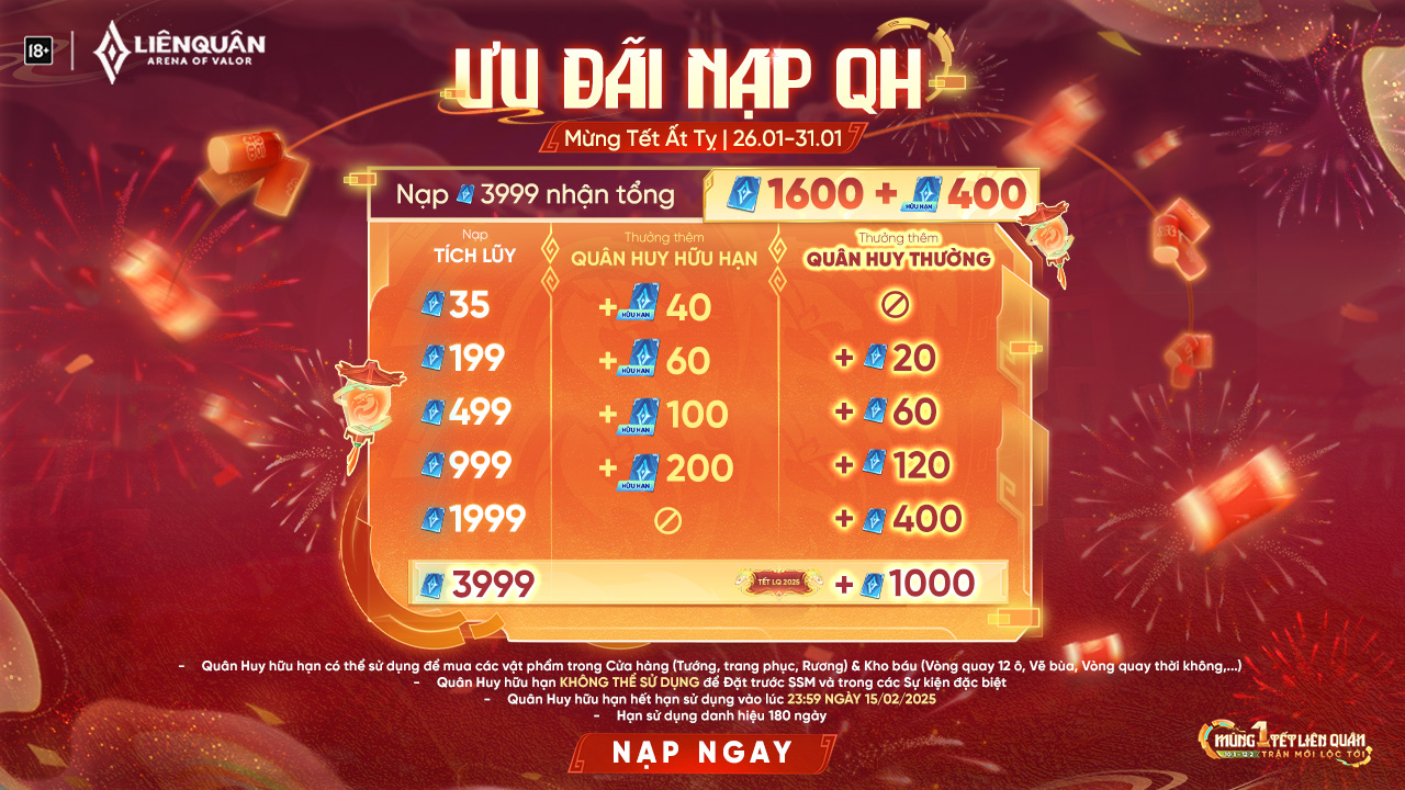 Đừng bỏ lỡ những mốc nạp như 35 Quân Huy và 40 Quân Huy hữu hạn nhé! Hãy áp dụng những mẹo săn quân huy khuyến mãi để tối ưu hóa số lượng quân huy mà bạn nhận được trong thời gian này. Chúc các bạn có những trải nghiệm game thật vui!