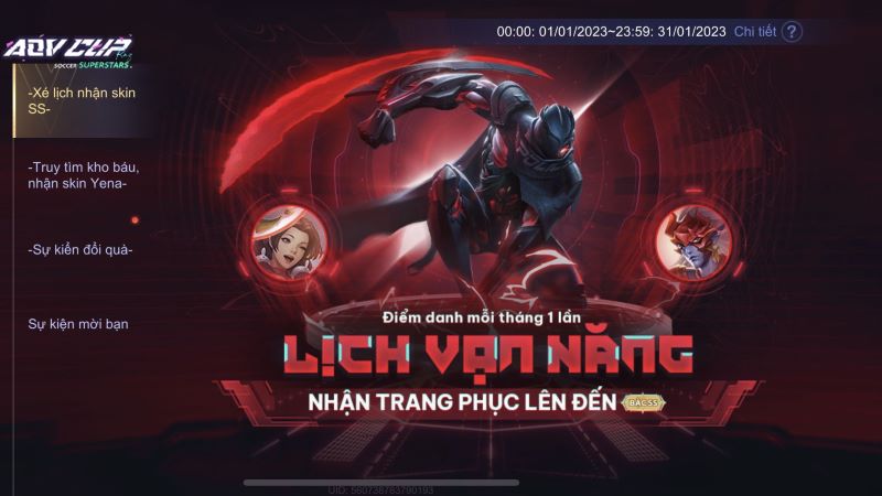 Để sử dụng Lịch Vạn Năng trong game Liên Quân, đầu tiên bạn hãy vào game và chọn vào ô Sự kiện. Tại đây, bạn nhấn vào phần “Xé lịch nhận skin SS” để truy cập tính năng này. Tiếp theo, bạn chọn mục “Điểm danh” để nhận được các loại chip như Chip Vạn Năng, Chip Tăng Tốc cùng những phần quà hấp dẫn như thẻ giảm giá cho trang phục.