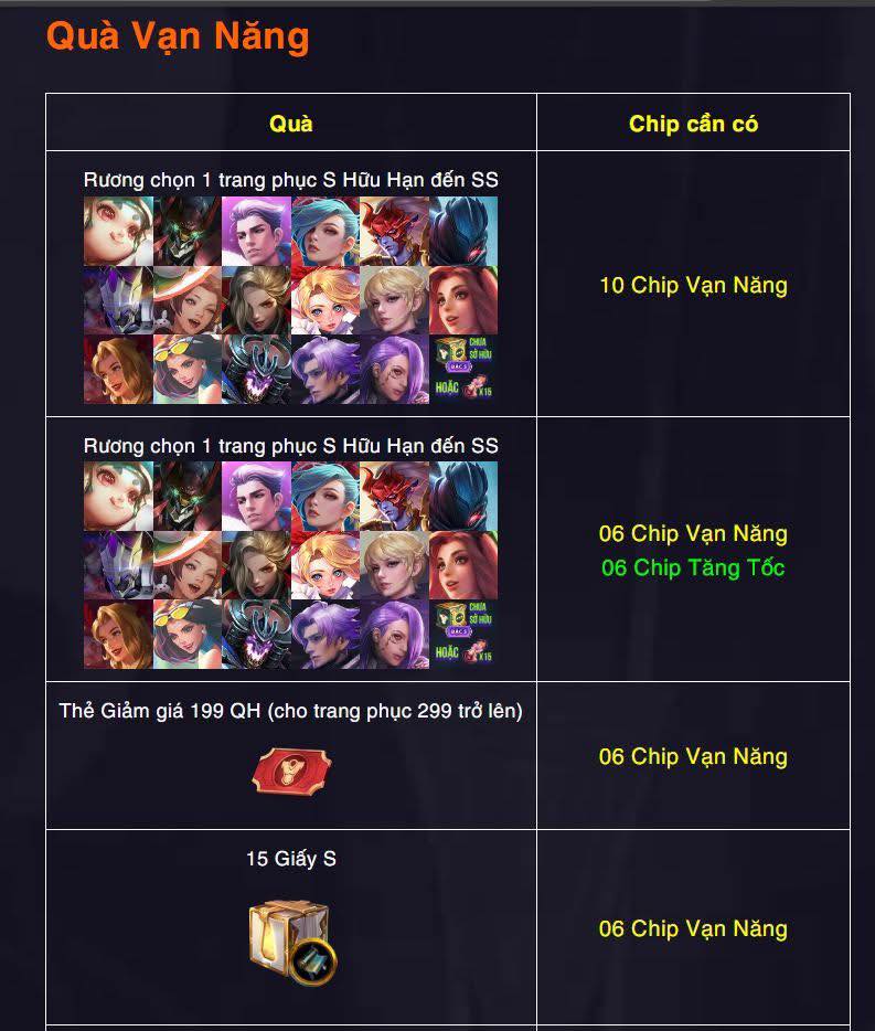 Mỗi tháng, người chơi sẽ có cơ hội thực hiện các nhiệm vụ khác nhau để thu thập chip. Chẳng hạn, việc đăng nhập đủ 7 ngày trong tháng sẽ giúp bạn tích lũy chip Tháng, còn chơi 5 trận 5v5 cùng bạn bè sẽ mang lại chip Vạn Năng. Nếu bạn hoàn thành 15 trận 5v5 thì chip Tăng Tốc cũng sẽ tới tay bạn.