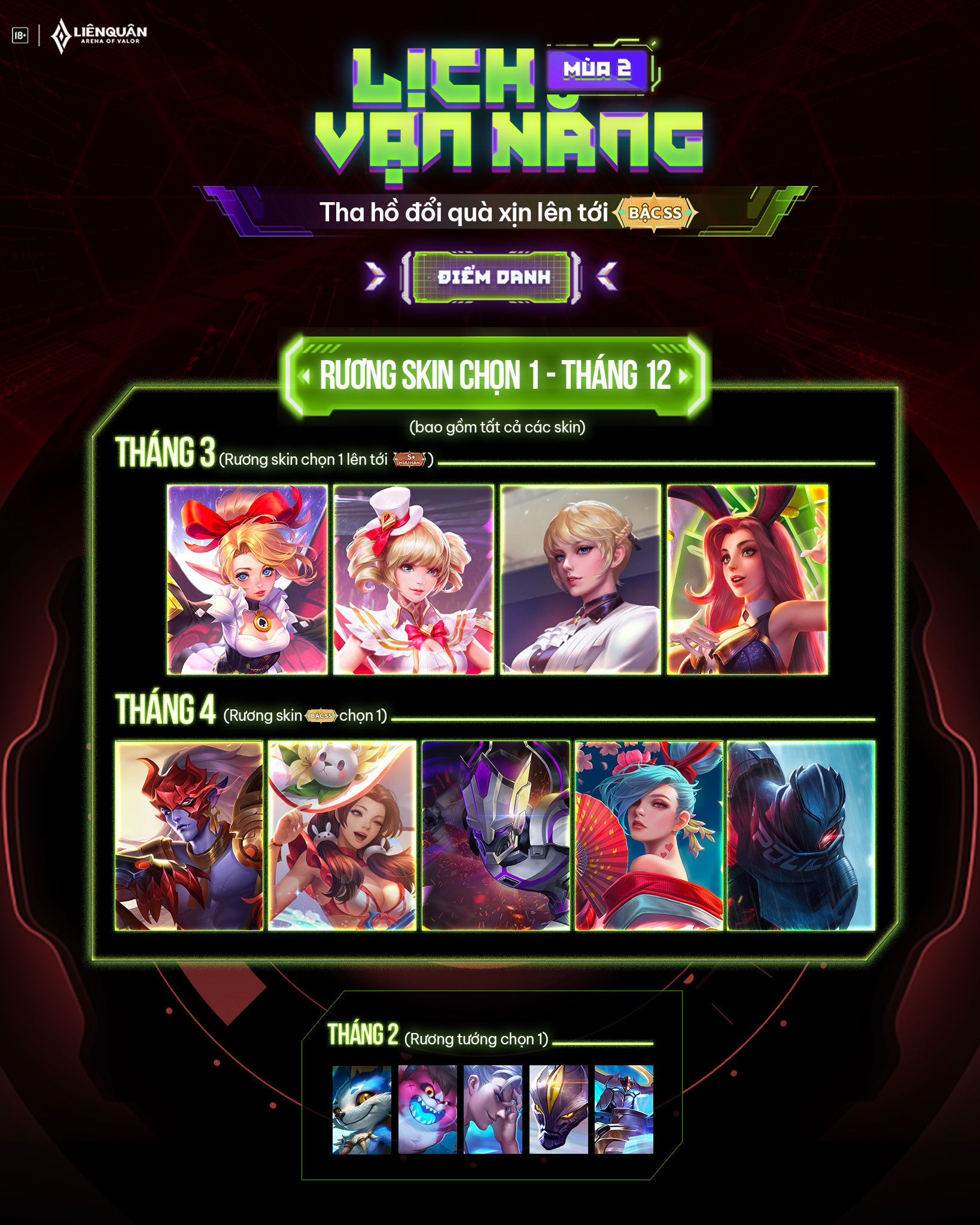 Lịch Vạn Năng 2025 trong game Liên Quân Mobile đang trở thành một chủ đề thu hút sự chú ý của đông đảo game thủ, đặc biệt là những người thích cày chay. Năm nay, sự kiện này không chỉ giúp anh em tích lũy điểm qua việc điểm danh hàng tháng mà còn mở ra cơ hội sở hữu những skin độc đáo, với những phần thưởng giá trị khác.