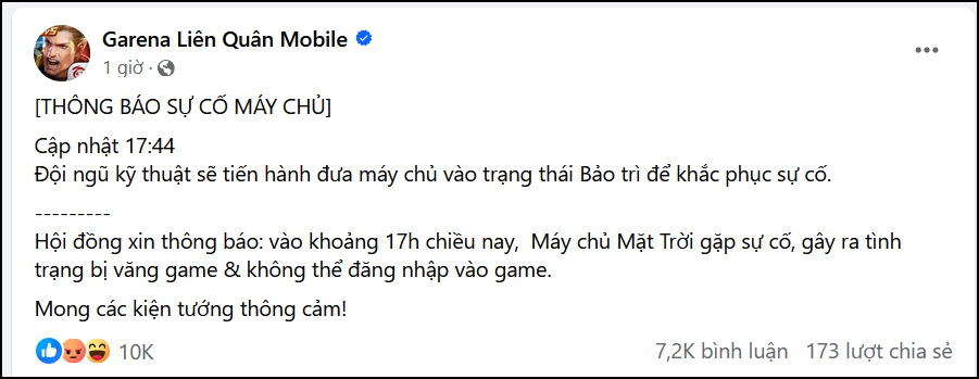 Chúng tôi xin lỗi vì sự bất tiện này, nhưng việc bảo trì là cần thiết để khắc phục các lỗi đăng nhập hay tình trạng sập server gần đây. Ngay khi quá trình bảo trì hoàn tất, chúng tôi sẽ thông báo lại để mọi người có thể quay lại trận đấu. Cảm ơn các Kiện Tướng đã luôn đồng hành cùng Liên Quân Mobile!