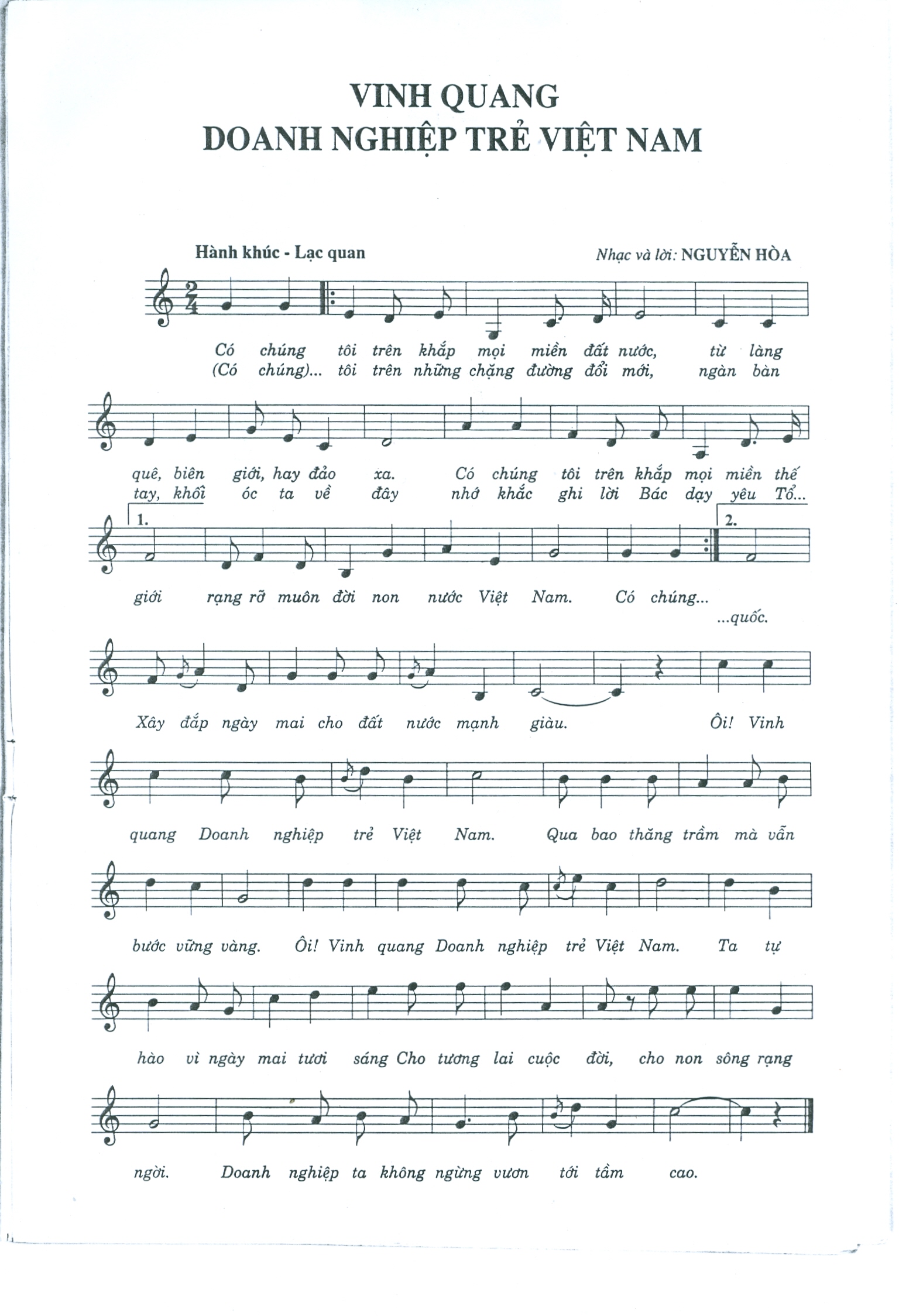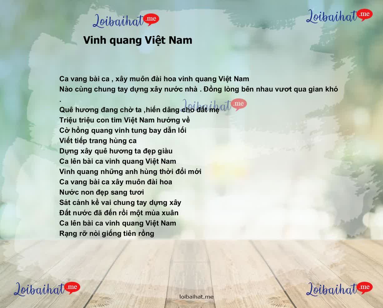 Cuối cùng, “Vinh Quang Việt Nam” không chỉ là một bài hát, mà còn là biểu tượng của tình yêu quê hương, lòng tự hào dân tộc. Với giai điệu hào hùng và lời ca sâu lắng, bài hát đã chạm đến trái tim của biết bao thế hệ, đồng hành cùng những bước tiến của đất nước. Qua từng câu chữ, chúng ta cảm nhận được sự khát khao vươn tới vinh quang, cùng nhau xây dựng một Việt Nam tươi đẹp. Hy vọng rằng, bài hát sẽ tiếp tục được lan tỏa và ghi dấu ấn trong tâm trí của mọi người, khơi dậy niềm tự hào dân tộc trong mỗi chúng ta.