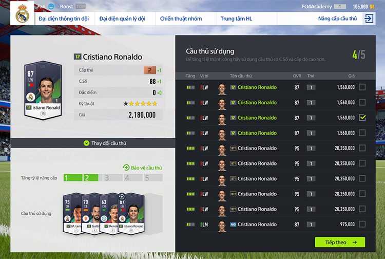 Đầu tiên, bạn cần đăng nhập vào tài khoản FO4 trên thiết bị của mình. Một khi đã ở giao diện chính, hãy chọn “Đại diện quản lý đội” và tiếp theo là “Nâng cấp cầu thủ”. Giai đoạn này rất quan trọng để bạn có thể lựa chọn cầu thủ mà mình muốn nâng cấp và cầu thủ bổ sung làm phôi.