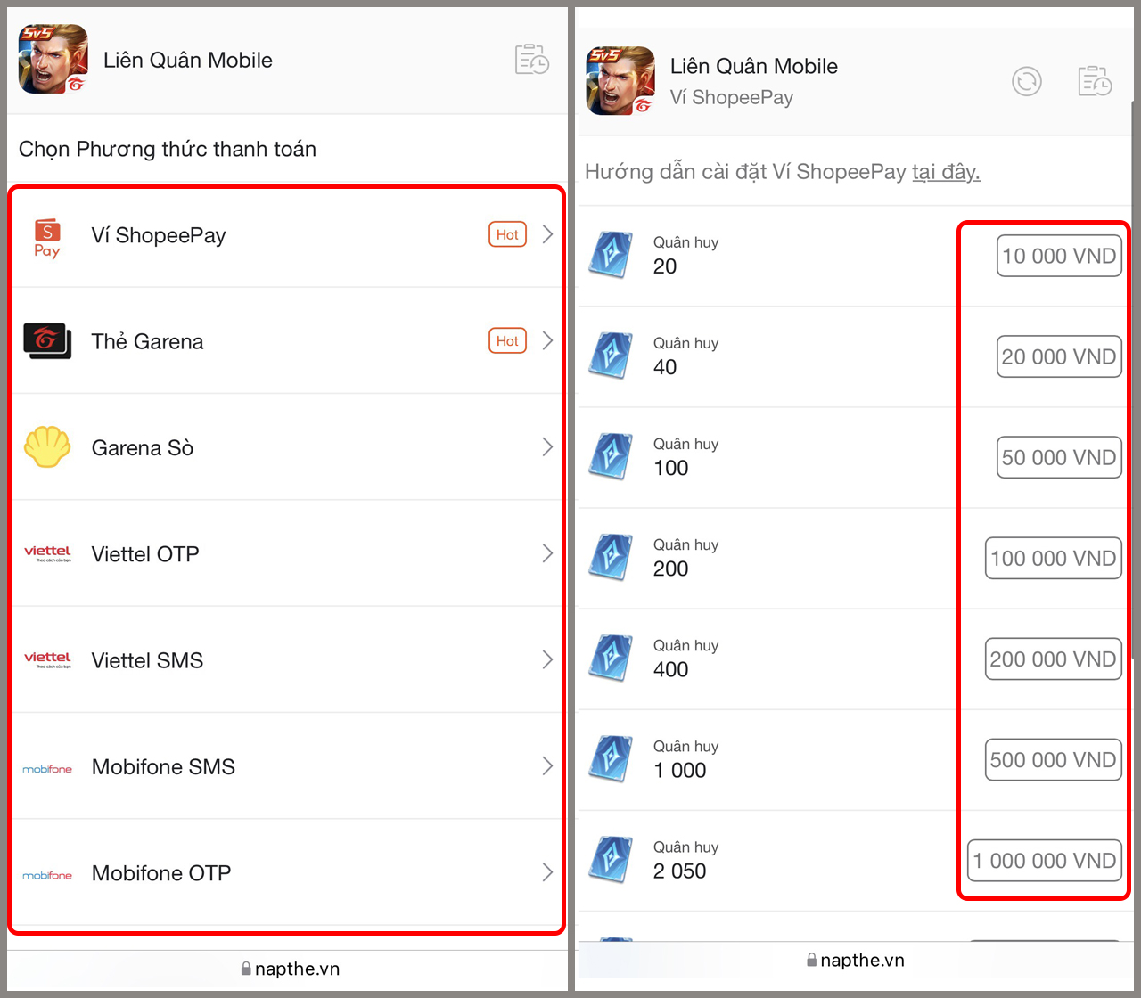 Một bước quan trọng nữa là chọn ô nạp thẻ và chọn hình thức bạn muốn nạp, chẳng hạn như nạp Sò, Quân Huy hay RP. Hãy chắc chắn rằng bạn đã chọn đúng gói nạp để nhận được những yếu tố mà mình mong muốn trong game.