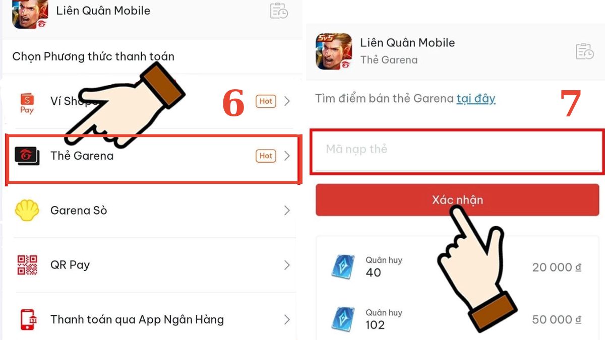 Sau khi đăng nhập, chọn ô nạp thẻ và hình thức thanh toán mà bạn ưa thích. Garena hỗ trợ nhiều phương thức nạp, từ nạp Sò, nạp Quân Huy, cho đến nạp RP và nạp FC, đảm bảo tính an toàn và tiện lợi cho người dùng. Đặc biệt, bạn có thể nạp tiền game thông qua ứng dụng Garena có sẵn trên cả Android và iOS.