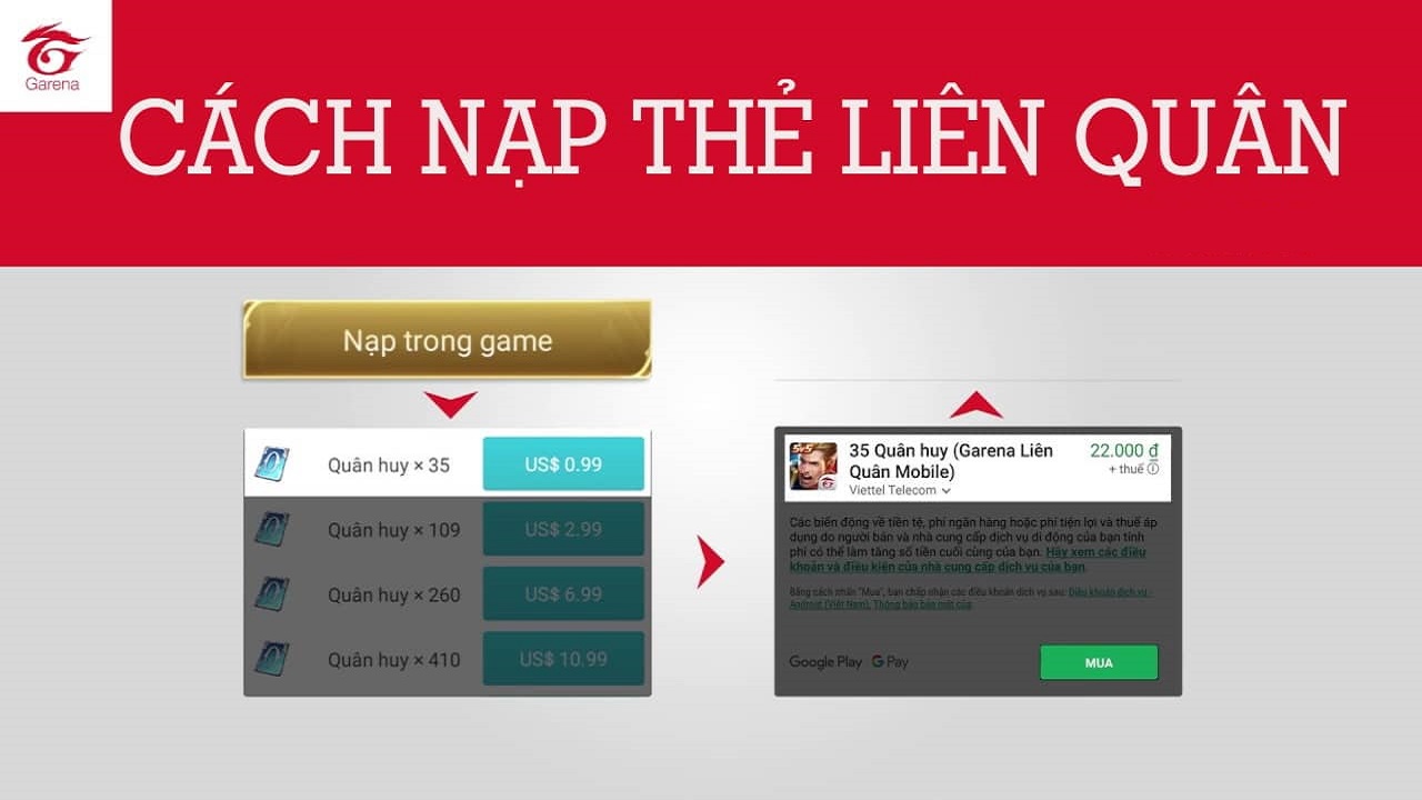 Ngoài ra, nạp qua Google Play cũng là một lựa chọn thú vị. Tại đây, người chơi có thể nạp bằng USD và nhận ngay số quân huy tương ứng. Bạn có thể dễ dàng truy cập vào trang nạp thẻ chính thức của Garena để thực hiện giao dịch một cách an toàn và nhanh chóng.