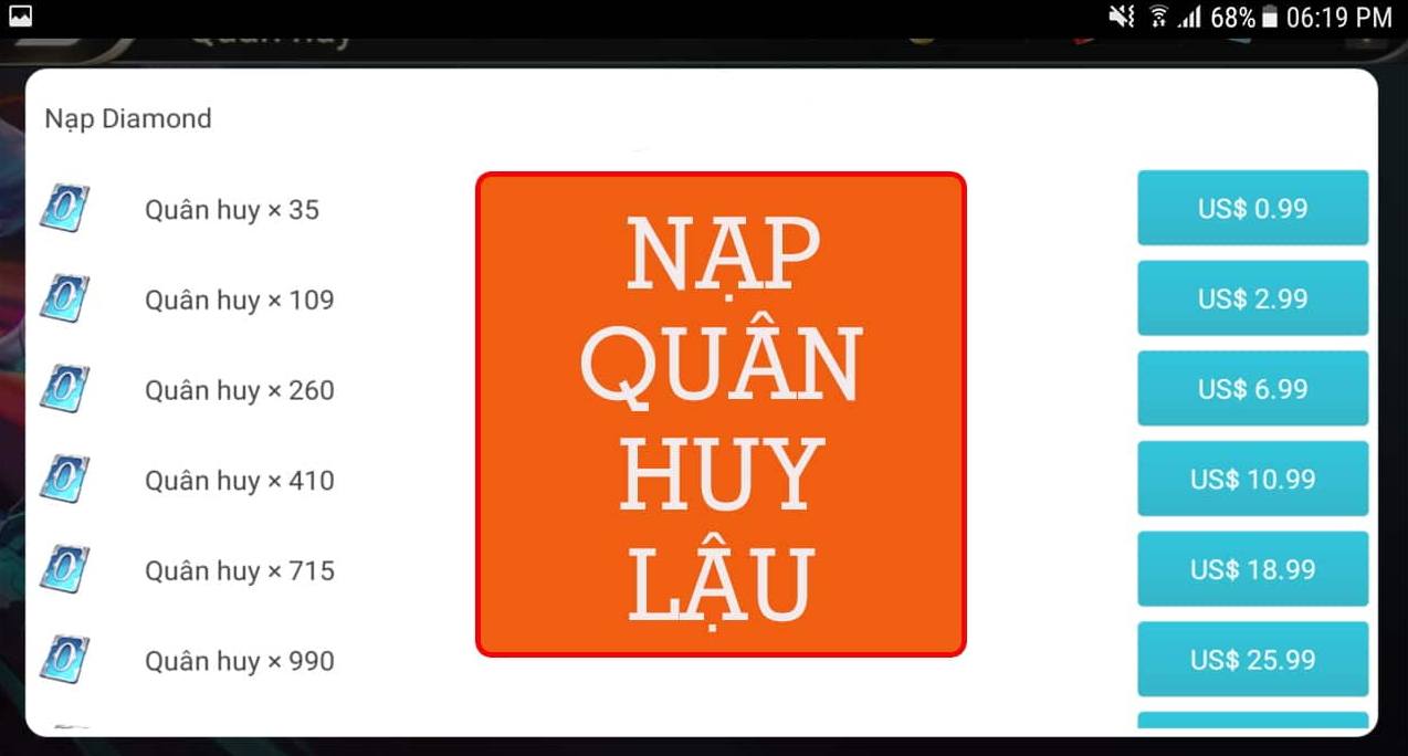 Chẳng hạn, với mức giá hấp dẫn, bạn có thể nhận ngay hàng trăm quân huy chỉ với 50.000 VND. Tuy nhiên, hãy cẩn thận, vì việc nạp quân huy lậu có thể dẫn đến nguy cơ khóa tài khoản vĩnh viễn. Những rủi ro này rất đáng lưu ý, đặc biệt là khi quân huy là đơn vị tiền tệ cao cấp trong game.