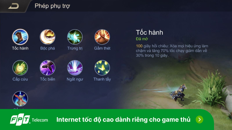 Ngoài ra, phép bổ trợ cần được kích hoạt chủ động, sau đó mới tính thời gian hồi. Điều này đòi hỏi người chơi phải có sự tính toán hợp lý trong từng tình huống. Các phép bổ trợ như Tốc Hành, Bộc Phá hay Trừng Trị cũng mang đến những lợi ích riêng, giúp người chơi tùy biến chiến thuật theo ý muốn.