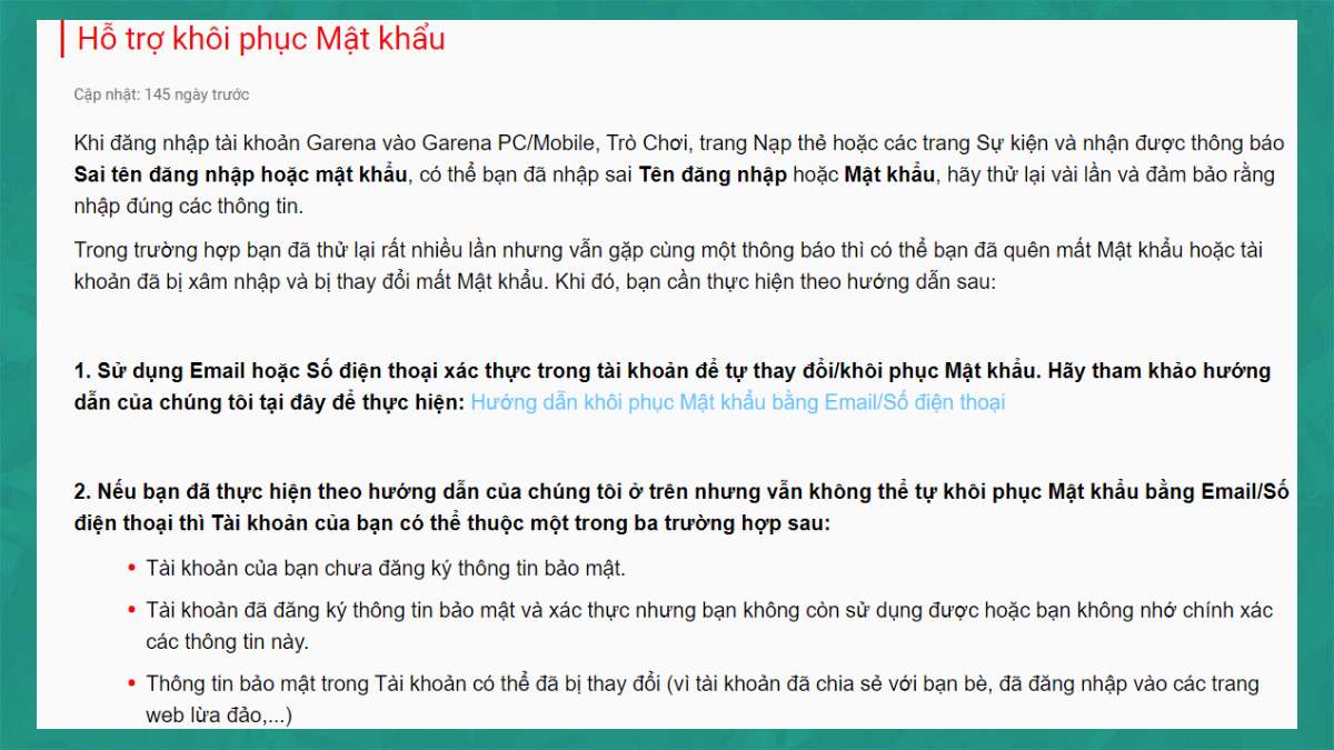 Ngoài ra, bạn cũng có thể gửi email tới địa chỉ hotro@garena.vn để nhận được sự trợ giúp. Hãy yên tâm rằng Garena cam kết không liên hệ với người chơi qua các kênh không chính thức, nên bạn chỉ cần lưu ý đến các thông tin đã cung cấp.