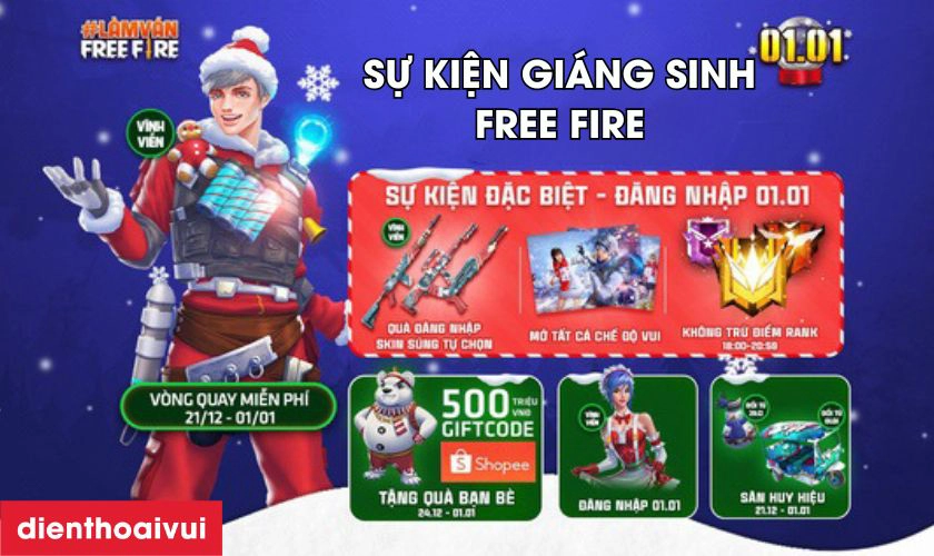 Trong hai ngày 24 và 25 tháng 12, cũng như vào dịp Năm Mới 1 tháng 1, Free Fire hứa hẹn sẽ mang đến nhiều bất ngờ đặc sắc cho người chơi. Bạn sẽ có cơ hội tham gia vào các vòng quay quà tặng với những skin cực chất và các vật phẩm hấp dẫn khác. Đừng quên đăng nhập và tham gia chơi game ít nhất 30 phút mỗi ngày trong thời gian diễn ra sự kiện để nhận tối đa ưu đãi.