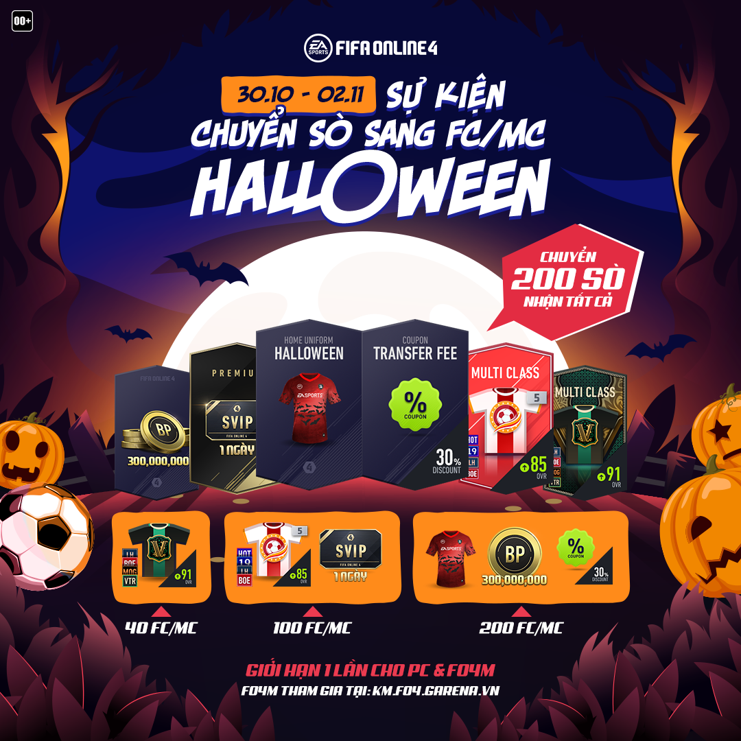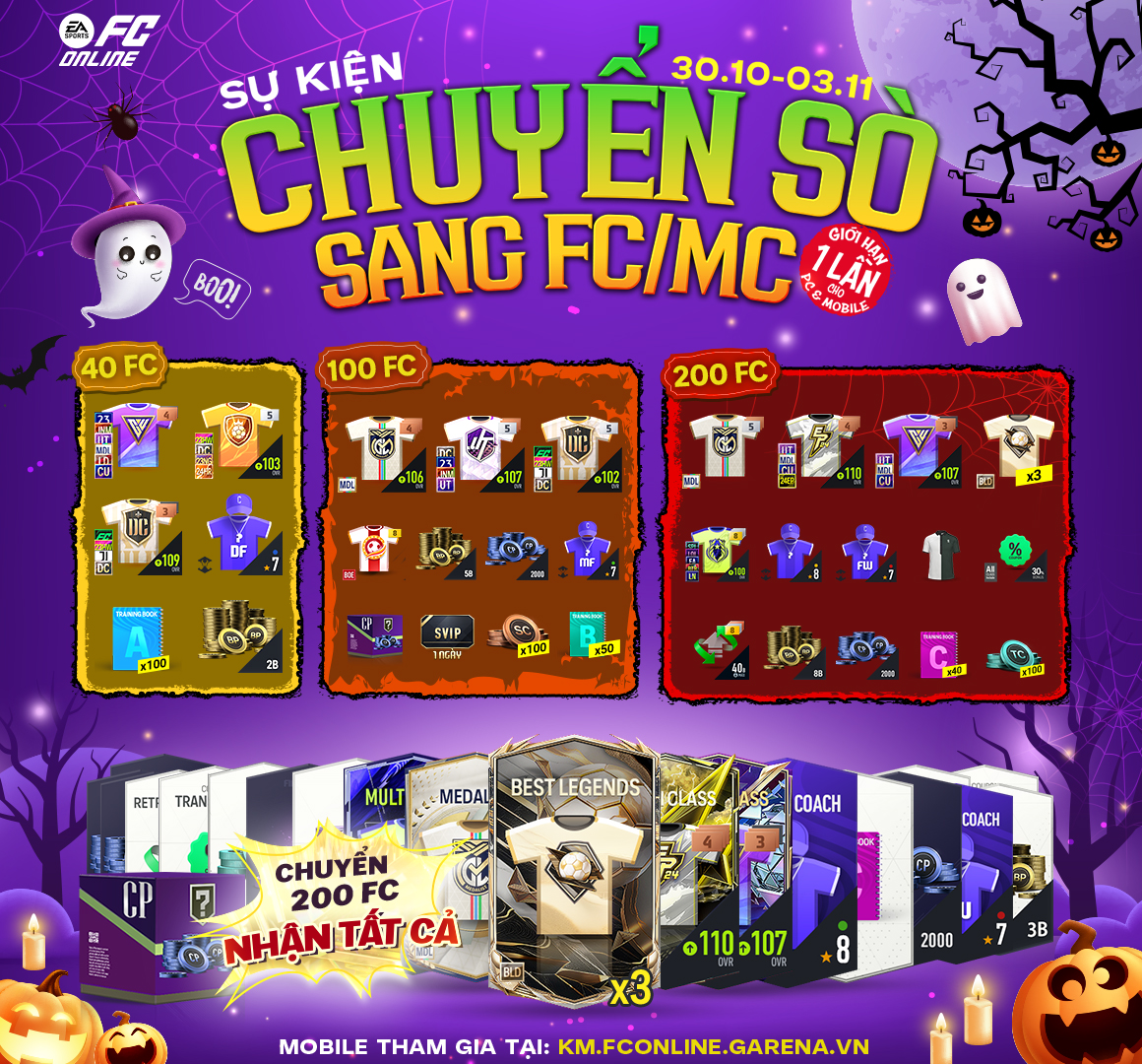 Chào các HLV, đã đến thời điểm mà mùa Halloween đang gõ cửa trong FC Mobile! Từ ngày 30.10 đến 02.11, sự kiện đặc biệt này sẽ mang đến ưu đãi lên tới 200% khi bạn chuyển sò sang FC. Đây là cơ hội không thể bỏ lỡ để tích lũy những phần quà hấp dẫn.