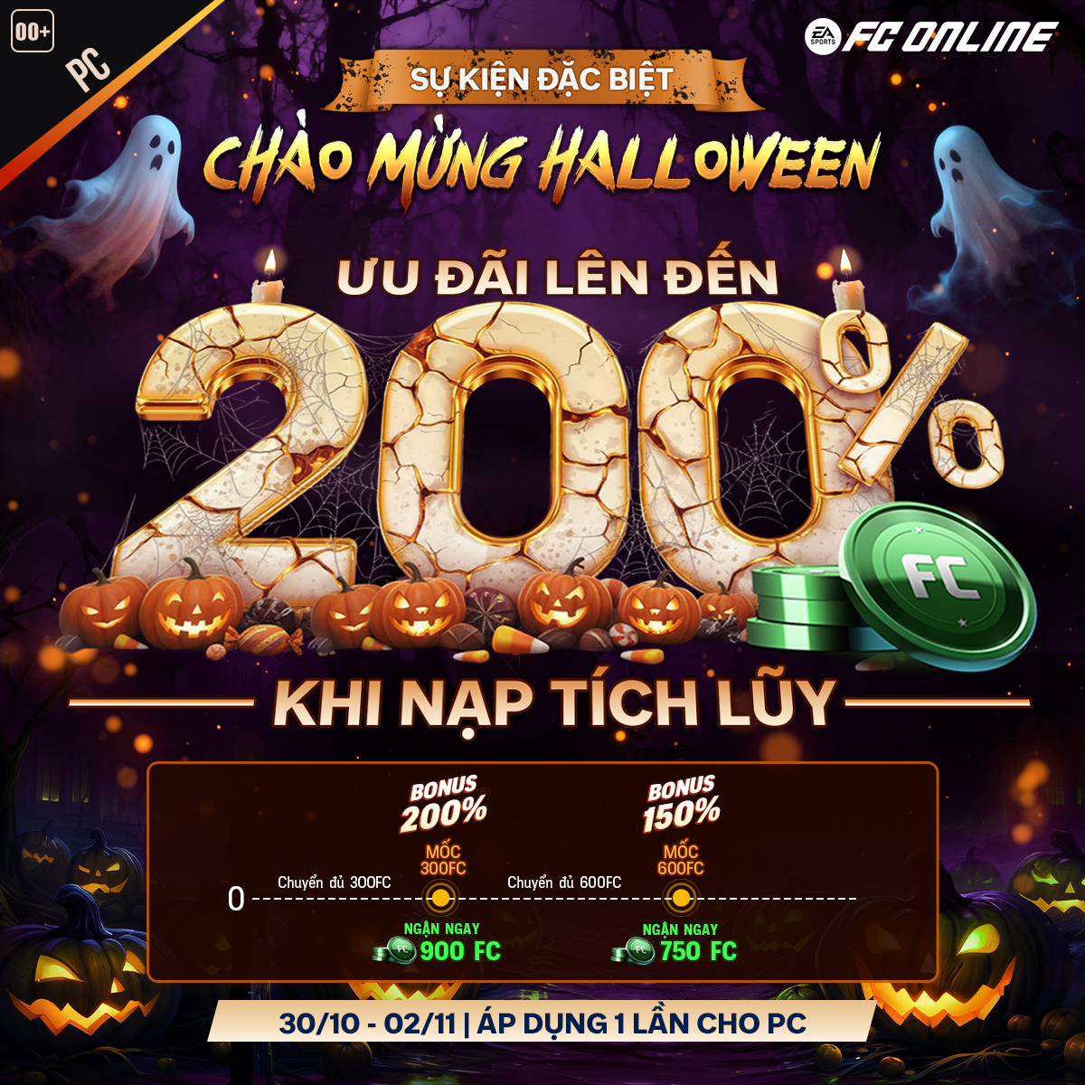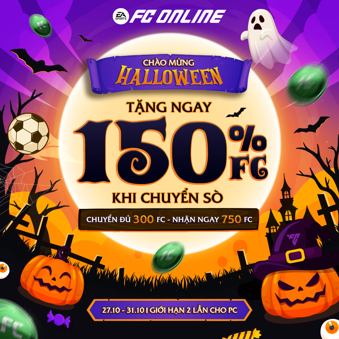 Chào các HLV thân mến! Tháng 10 này, không khí Halloween đang tràn ngập trên các sân cỏ của FC Online, và chúng ta có một sự kiện cực kỳ hấp dẫn. Từ ngày 30.10 đến 02.11, sự kiện đặc biệt mùa Halloween sẽ chính thức diễn ra với ưu đãi lên đến 200% khi bạn chuyển sò sang FC. Đây là cơ hội tuyệt vời để tăng cường đội hình của mình!