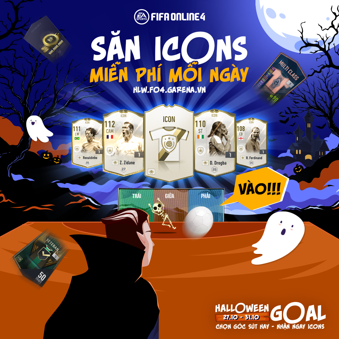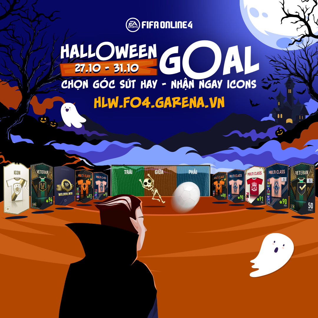 Hòa cùng không khí Halloween đang gần kề, FIFA Online 4 hân hoan giới thiệu sự kiện HALLOWEEN GOAL: CHỌN GÓC SÚT HAY – NHẬN NGAY ICONS. Đây là cơ hội tuyệt vời để các HLV tham gia vào các thử thách và nhận nhiều quà tặng hấp dẫn. Để tham gia, bạn chỉ cần hoàn thành 3 trận đấu bất kỳ trong game, với các chế độ như XH, GLXH, Volta Live hoặc Arena.