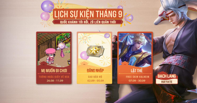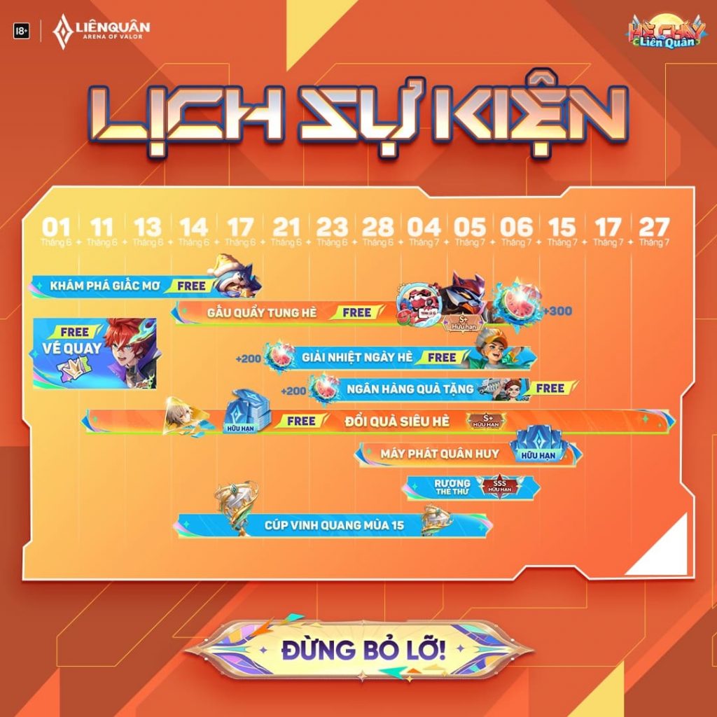 Bên cạnh đó, sự kiện “Hè Cháy Liên Quân” từ 11/6 đến 6/7 sẽ mang tới những phần quà hấp dẫn, bao gồm quân huy miễn phí. Ngày 19/9, chế độ giải trí “Đại Chiến Capoo Titan” cũng sẽ khiến cho các trận đấu thêm phần thú vị.