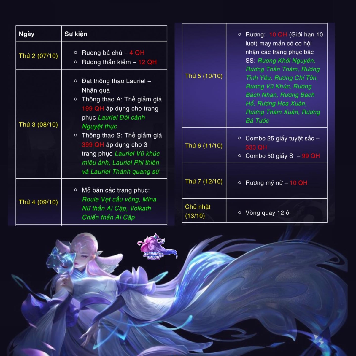 Từ ngày 31 tháng 3 đến 6 tháng 4, các sự kiện tiếp theo sẽ không kém phần sôi động. Ngày 31 tháng 3 sẽ có rương đá Nakroth Cao cấp, tiếp theo là các phần quà khác vào các ngày sau đó. Đặc biệt, sự kiện Mảnh ghép màu nhiệm diễn ra từ ngày 14 đến 20 tháng 10 hứa hẹn mang đến những trang phục đẹp mắt.