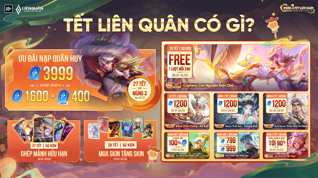 Cùng với đó, nhiều sự kiện hấp dẫn khác trong Liên Quân Mobile cũng đang diễn ra. Những ngày tháng 1 năm 2026, game thủ sẽ được tham gia sự kiện Rinh Lộc Lân Sư và Vẽ bùa Ất Tỵ, mang đến cơ hội nhận những phần quà giá trị như trang phục Allain Lân Sư Vũ Thần. Không chỉ dừng lại ở đó, trong tháng 6 cũng sẽ có sự kiện rương băng vương, nơi người chơi có thể nhận được những trang phục tuyệt đẹp như Murad Chí tôn thần kiếm hay Quillen Nghịch thiên long đế.