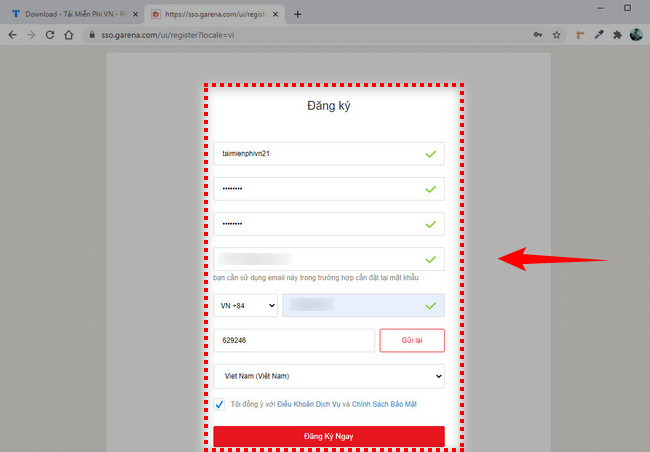 Khi đã điền đầy đủ thông tin, đừng quên tick vào mục xác nhận bạn đã đọc Điều Khoản Dịch Vụ và Chính Sách Bảo Mật. Sau đó, bạn có thể nhấn nút tạo tài khoản và chờ đợi email xác nhận. Nếu bạn đã có tài khoản Garena, chỉ cần đăng nhập bằng tài khoản đó là được.