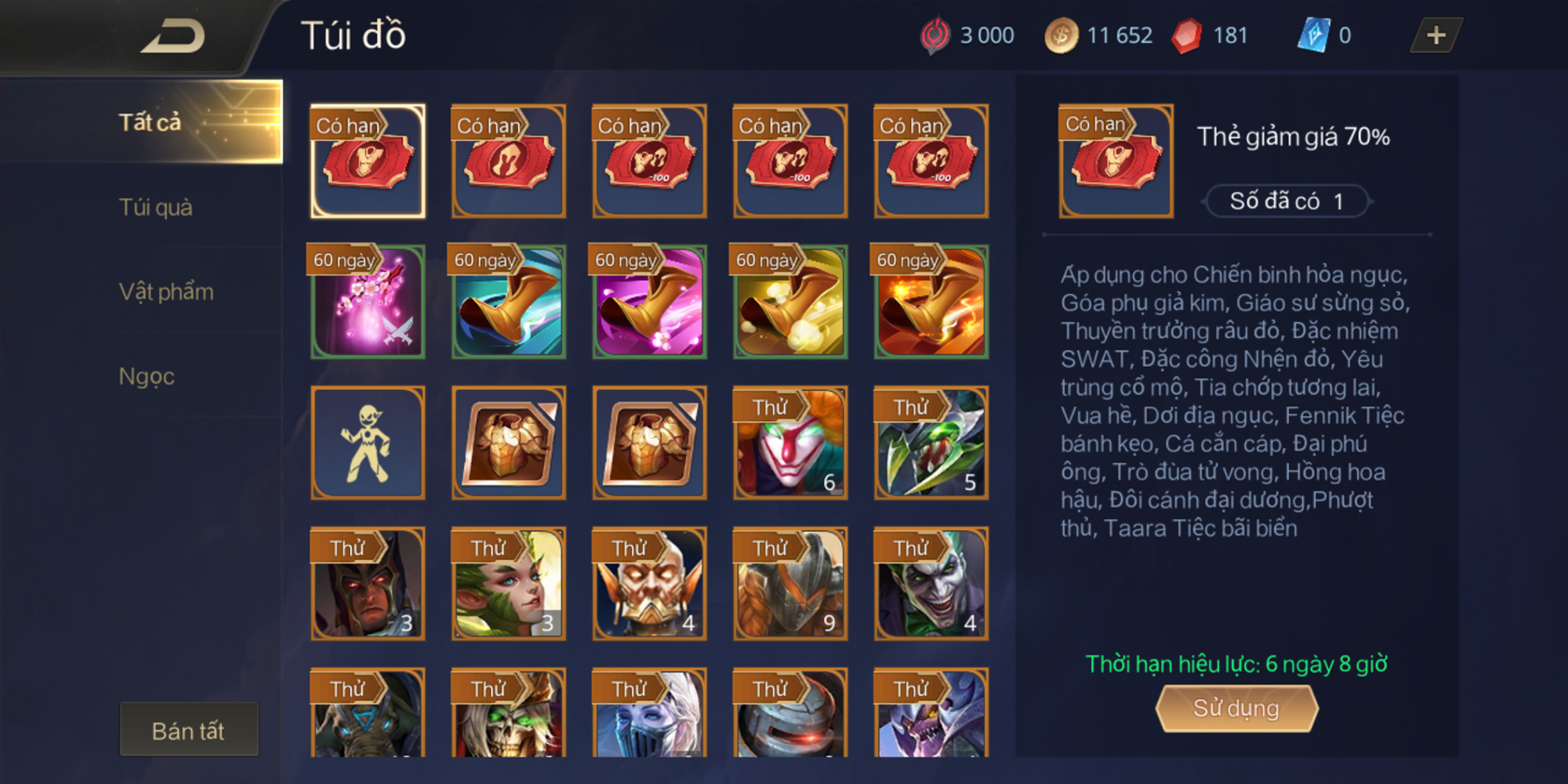Đặc biệt, thẻ giảm giá này rất linh hoạt, giúp bạn có thể trang bị cho những nhân vật yêu thích mà không cần đầu tư quá nhiều. Ai cũng muốn sở hữu các skin đẹp như S, SS hay SSS mà không phải lo lắng về giá cả.