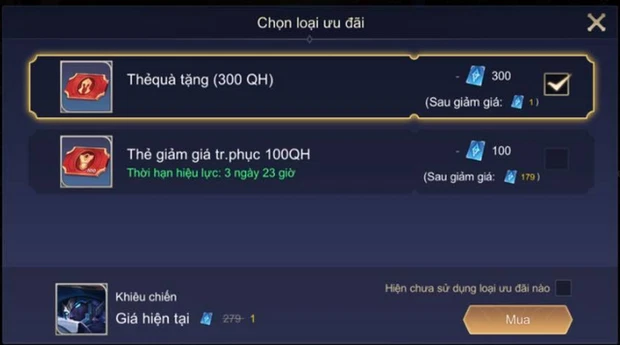 Khi bạn gặp khó khăn trong việc mua trang phục nhưng không thấy mức giảm, có thể là do bạn chưa chọn đúng skin nằm trong danh sách ưu đãi. Thẻ giảm giá giúp bạn tiết kiệm quân huy mà vẫn sở hữu những bộ skin chất lượng, từ đó làm phong phú thêm bộ sưu tập của mình.