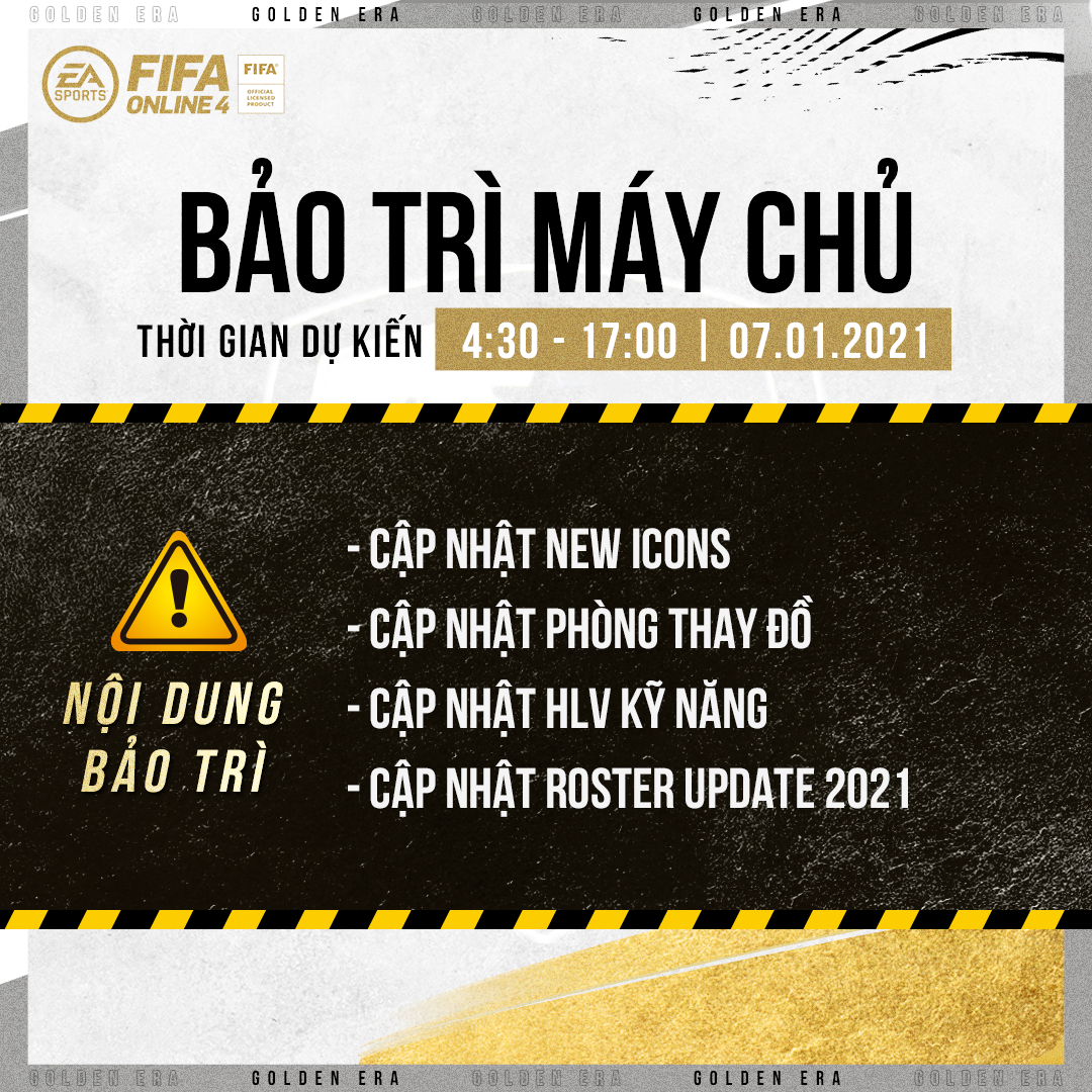 Trong thời gian bảo trì, các HLV lưu ý đăng xuất khỏi game để tránh những rắc rối không đáng có. Rất mong tất cả các bạn kiên nhẫn chờ đợi để sớm quay trở lại sân cỏ và cùng nhau chinh phục những thử thách mới trong FIFA Online 4!